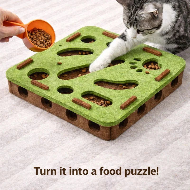 Turn mealtime into a"Cognitive Gym"by dropping kibble into the felt maze. This triggersDynamic Tactile Foraging, forcing your cat to calculate angles and "capture" their prey. It drains high-energy "zoomies" and satisfies the hunting cycle without the loud clattering of plastic.